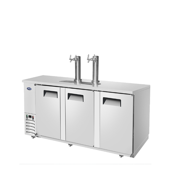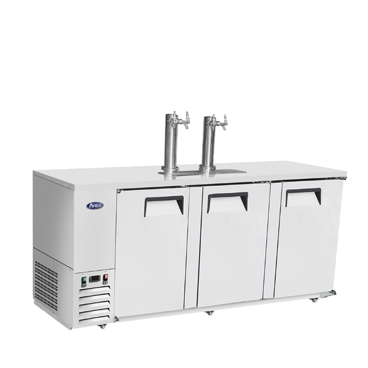 The MKC90GR Draft Beer Cooler - is a professional grade commercial refrigeration unit designed for high-volume beverage service environments. Built by Atosa USA, Inc., this model features a 89-3/10"W x 28-1/10"D x 55-3/5"H stainless steel construction with side-mounted self-contained refrigeration. It provides storage for up to four 1/2 barrel kegs (30.1 cu. ft.), ensuring efficient draft beer dispensing. The unit is equipped with two dual faucet towers and three locking solid doors for secure, easy access, complemented by a Dixell digital controller for precise temperature management. Its environmentally friendly R290 Hydrocarbon refrigerant enhances operational efficiency, while 2" casters facilitate mobility within commercial settings. Specifically engineered for restaurant, bar, or catering operations, the Atosa MKC90GR offers robust durability, optimized workflow integration, and reliable temperature stability essential for maintaining beer quality and service speed.