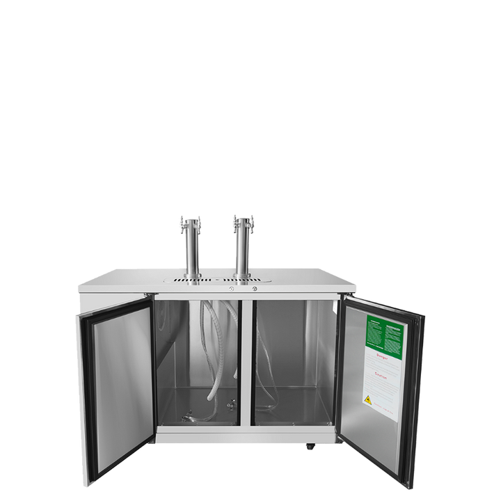 The Atosa MKC58GR Draft Beer Cooler - is a commercial-grade refrigeration unit designed for efficient beverage storage and service in hospitality environments such as bars, restaurants, and catering facilities. Measuring 57-4/5" in width, 28-1/10" in depth, and 55-3/5" in height, this self-contained draft beer cooler features dual columns equipped with two faucet towers, providing a capacity of two half-barrel barrels (17.3 cu. ft.). Its stainless steel interior and exterior ensure durability and ease of cleaning, making it suitable for high-traffic settings. Equipped with side-mounted Dixell digital controls, this unit allows precise temperature management, while the hydrocarbon R290 refrigerant promotes environmentally conscious refrigeration performance. The unit is built with 2" casters for mobility and includes essential components such as manifold and ball taps, ensuring seamless integration into commercial beverage service workflows.